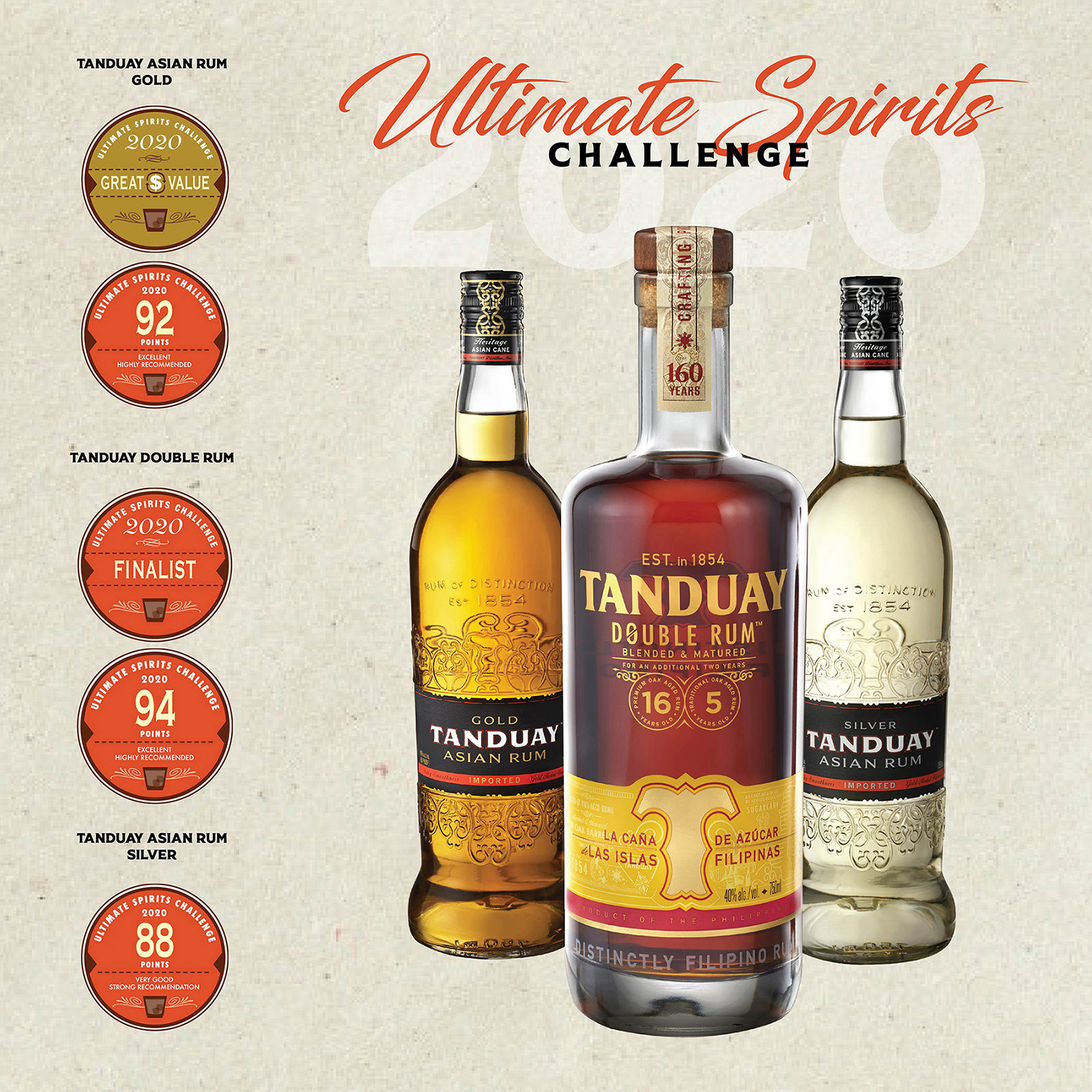 The Tanduay Double 16 Years Old Aged Rum was a finalist for the rum category, receiving a rating of 94 and was adjudged excellent and highly recommended. Tanduay Asian Rum Gold, meanwhile, received a 92 rating and was also adjudged excellent and highly recommended. With a rating of 88, Tanduay Silver Asian received a strong recommendation and was deemed very good.