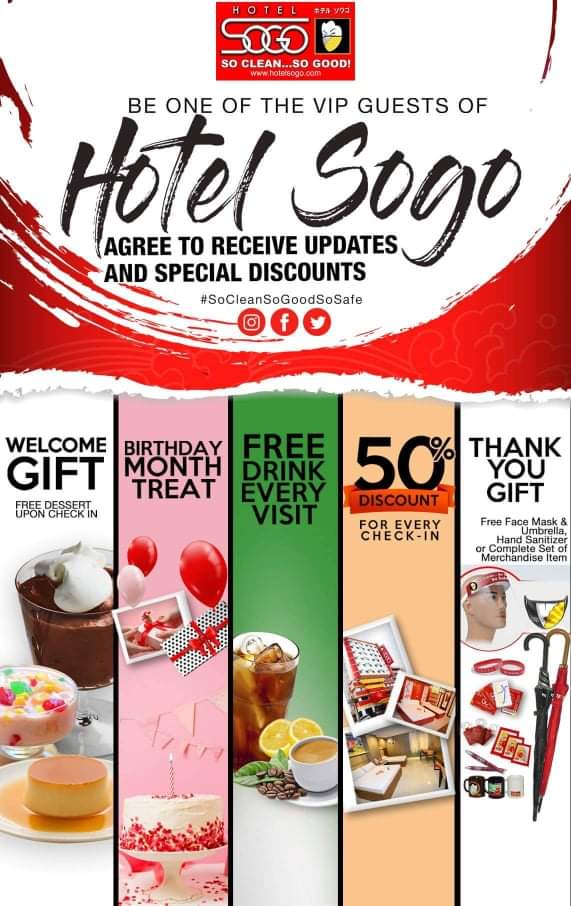 To find out operational Hotel Sogo branches and for updates and promos, visit our website at http://www.hotelsogo.com or like and follow us on Facebook page @HotelSogoOfficialPage, Twitter and Instagram @hotelsogo, and Youtube account @OfficialHotelSogo.